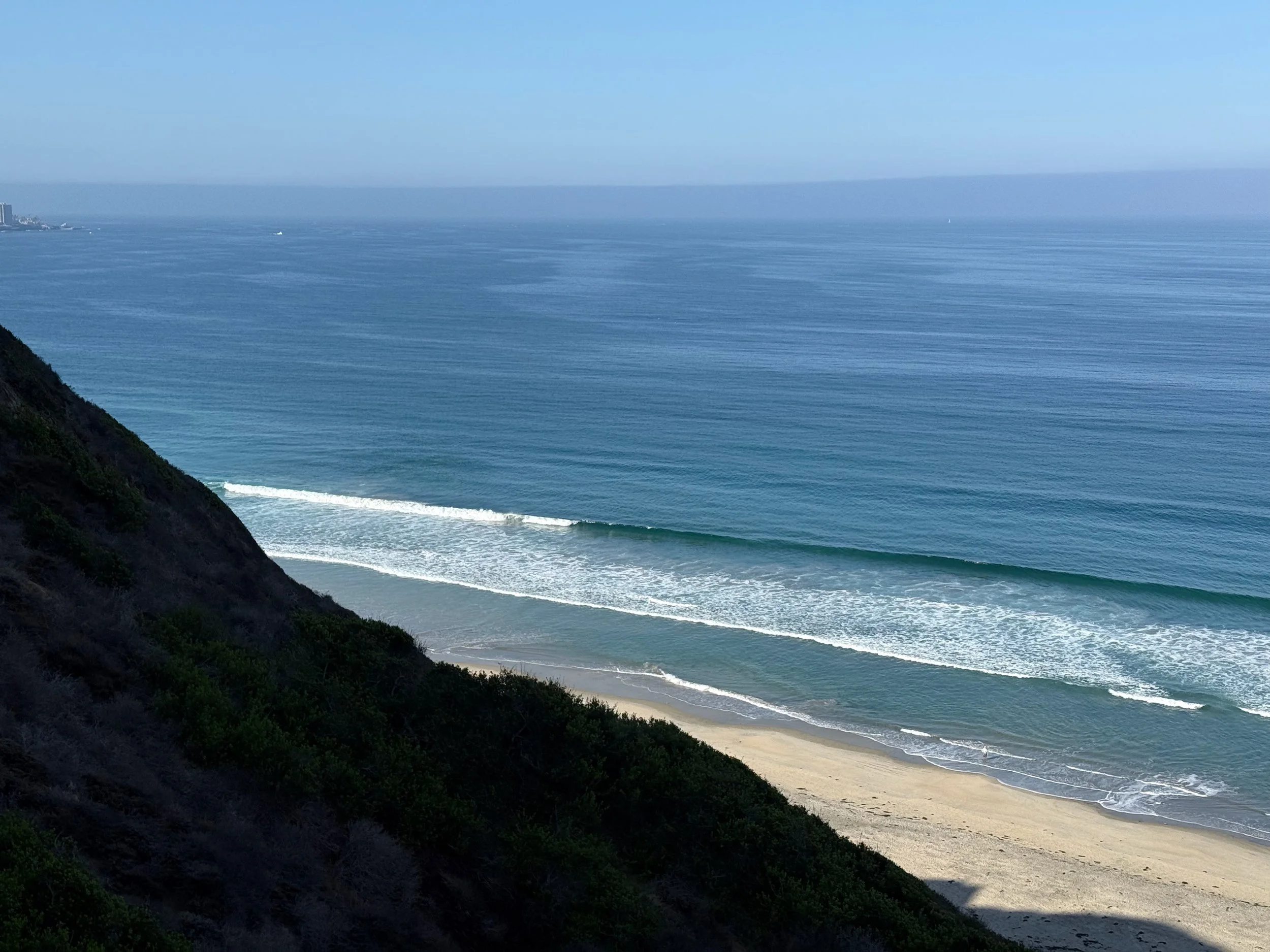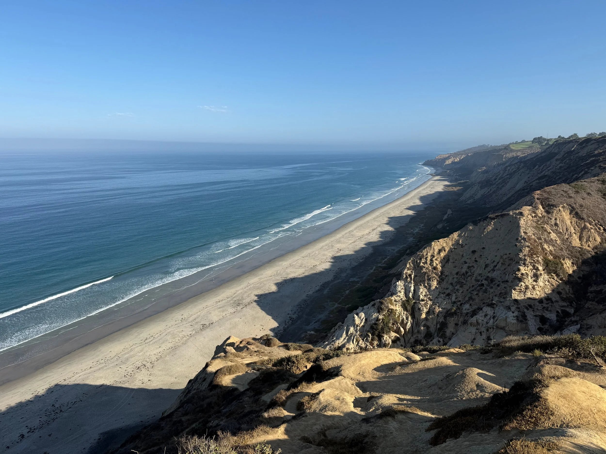 A view of a sandy beach along the ocean near Carlsbad, CA, with cliffs on one side and a clear blue sky above.