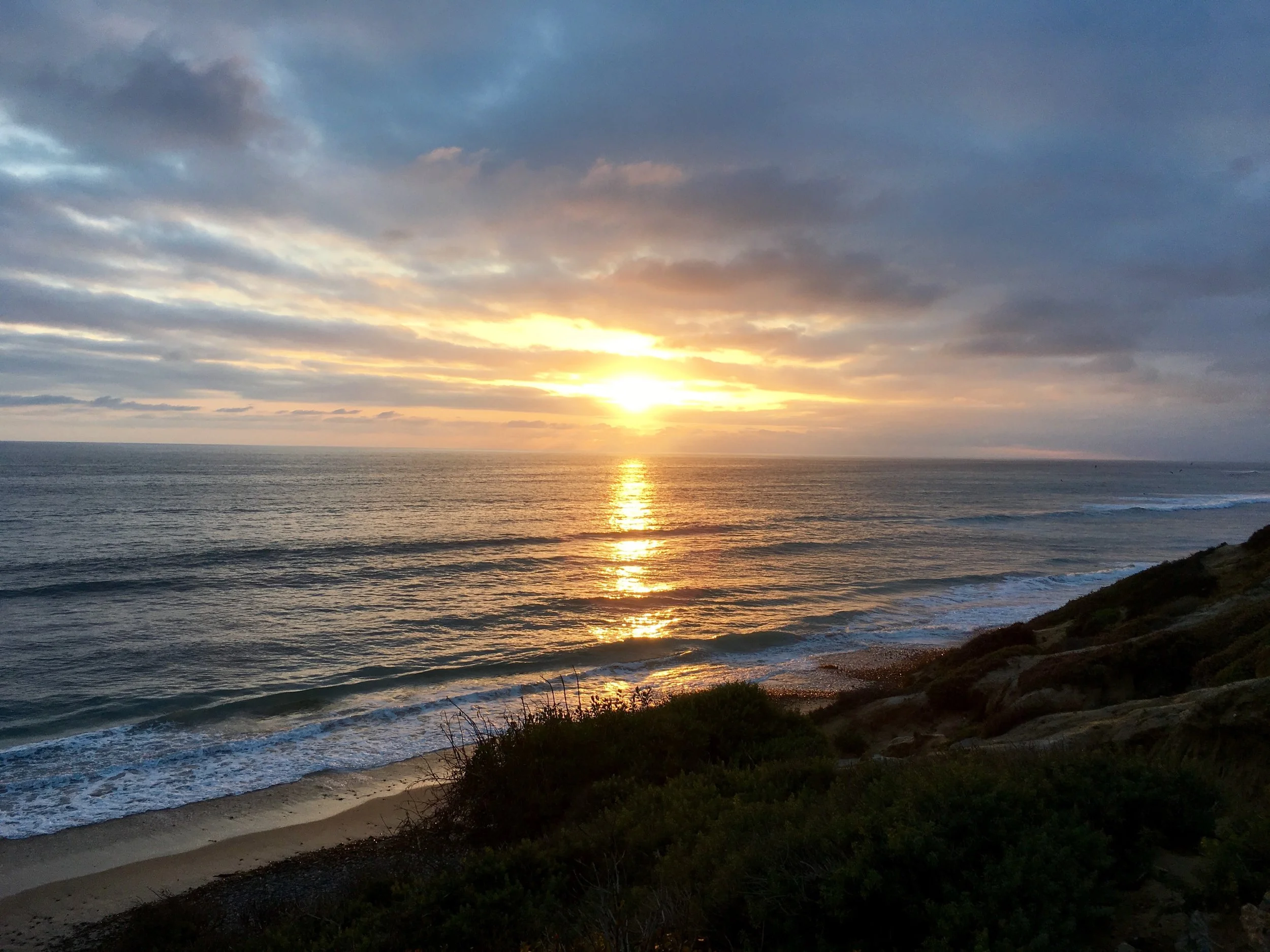 A view of the ocean in Carlsbad, CA with gentle waves and a partly cloudy sky, seen from a sandy beach with some greenery in the foreground.